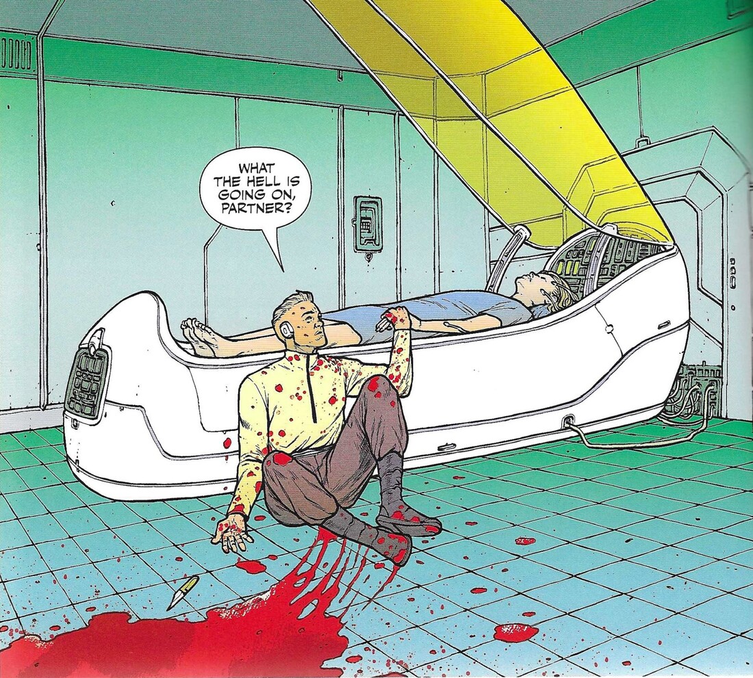 Of course, Phillips is tremendous. He creates interesting looking characters who feel real, even in Hollywood, where they’re slightly more attractive than normal but not ridiculously so. He contrasts the more wide-open spaces of Los Angeles with the more decrepit Bay City really nicely, but he knows that L.A. can be seedy, too, and he gives that to us. Everything looks lived-in, and Phillips’s use of spot blacks continues to be superb — it’s always been good, but he uses the blacks with, it seems, a bit more nuance than he used to. His son continues to do amazing work with the colors, as he uses shading really well and chooses nice bright colors for Hollywood, masking some of the rot beneath it, and he does very good work with the blues and purples in some of the darker scenes. Phillips the Elder usually works with good colorists, but it seems that Phillips the Younger can use modern coloring techniques and not screw with the linework, which is occasionally what happens. It’s a good blend.
