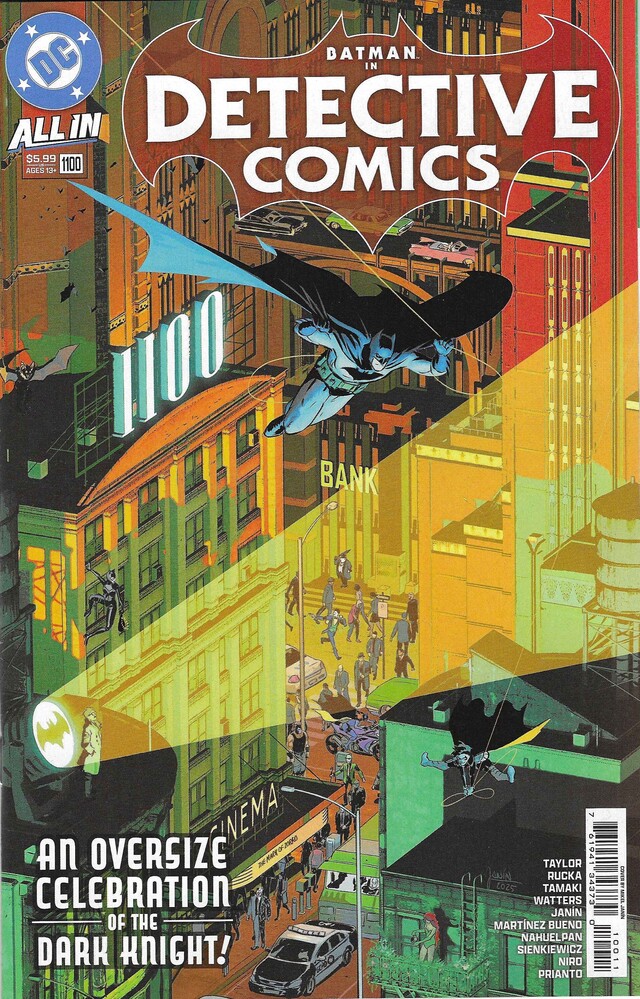 Detective Comics #1100: “Lost and Found” by Tom Taylor (writer), Mikel Janín (artist)/colorist), and Wes Abbott (letterer); “Your Role in the Community” by Mariko Tamaki (writer), Amancay Nahuelpan (artist), Arif Prianto (colorist), and Ariana Maher (letterer); “The Knife and Gun Club” by Greg Rucka (writer), Álvaro Martínez Bueno (artist), Giovanna Niro (colorist), and Tom Napolitano (letterer); “The Fall” by Dan Watters (writer), Bill Sienkiewicz (artist), and Tom Napolitano (letterer); and Ben Meares (editor). $5.99, 48 pgs, DC.