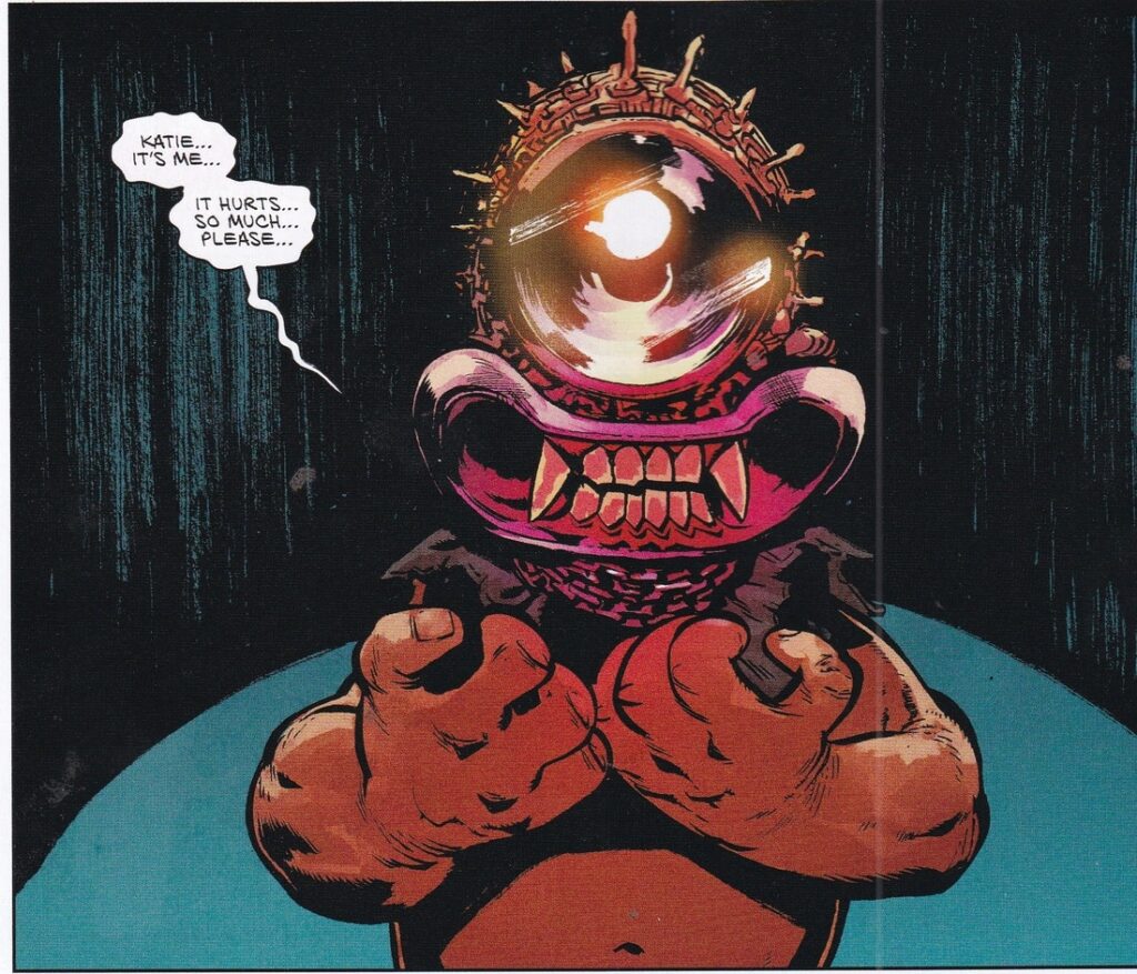 Anyway, Hello Darkness is just slightly better than Epitaphs, but they’re both solid horror anthologies. Epitaphs gives us four stories – 8, 10, 8, and 6 pages long – while Darkness has six stories – 8, 6, 5, 3, 6, and 11 pages long, plus a gag page by Robert Hack. Darkness has two continuing stories – Tynion and Dell’Edera do a Something Is Killing the Children intro, while Garth Ennis and Becky Cloonan (the book’s main draw) have the long chapter at the end, as a group of friends in New York have to deal with a nuclear war (the story is a lot of talking about Russia and Ukraine, and it ends with the war beginning). I don’t know if Ennis is trying to make the characters the tiniest bit obnoxious, as they’re a bunch of hipsters (there’s a man bun!) talking about things they have no experience with but suddenly, it appears they’re going to have plenty of experience, but it’s not a bad opening, and Cloonan’s art is terrific, of course. The other stories in Darkness are decent – a bunch of kids start murdering their parents, and I guess we’re supposed to understand why by the end, but I didn’t, exactly; an old bowler gets grumpy that a young punk gets a chance to bowl in the “big leagues,” so he goes nuts – this story is very, very darkly humorous, as a lot of good horror is; a guy in a lighthouse hears a siren, but resists her … a bit; a narcissistic dude gets a “foster” hand (it makes sense if you don’t worry about it!) so he can be seen as a hero, and that doesn’t go as he planned (this story is drawn by A.L. Kaplan, who’s a really good artist who doesn’t get nearly enough work). In Epitaphs, the stories are a bit more … EC-like, maybe? All are self-contained, and they all have nasty twists in them that make them more in the 1950s EC vein. In one, a writer who thinks he’s a genius reads his roommate’s screenplay, which is truly a work of genius, and that doesn’t go over well; a reporter wonders why a conservative, pro-choice senator changed her tune and finds out something nasty about politics; a man is forced to either kill himself or one member of his family or a bunch of armed thugs will kill all of them, and of course there’s a fun twist at the end (Phil Hester draws this, and it’s the best looking and best designed art in the book); and two people are hiding out from a group of deformed humans with a sinister (and, of course, twistedly humorous, because EC) agenda.