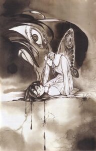Friends, I am not someone who is going to blow smoke up your ass or anywhere near your body. I certainly like dissecting comics, perhaps too much according to some of you, and I like trying to break down themes and metaphors and whatnot in fiction, especially comics. I like using high-falutin’ words when it suits me, because high-falutin’ words are fun. But I will also tell it like it is, because occasionally, comics need to be punctured a bit because they get too full of themselves. On the back of this very nice hardcover (seriously – I do hope Dstlry is doing/does well, because not only is Chip Mosher a co-founder, and Chip’s a good dude, but their actual products are gorgeous), the “solicit” reads: “SOMNA’s intoxicating blend of history, eroticism, and the supernatural will transport readers to a world where passion and spirits intertwine, enrapturing your senses and leaving you craving more ..” No time for a proper ellipse in that description! If you read between the lines of this breathless synopsis, you can perhaps glean what Somna actually is: IT’S SOFTCORE PORN! I mean, listen, there’s nothing wrong with that, but come on – it’s porn. Beautifully drawn porn, to be sure, but still.