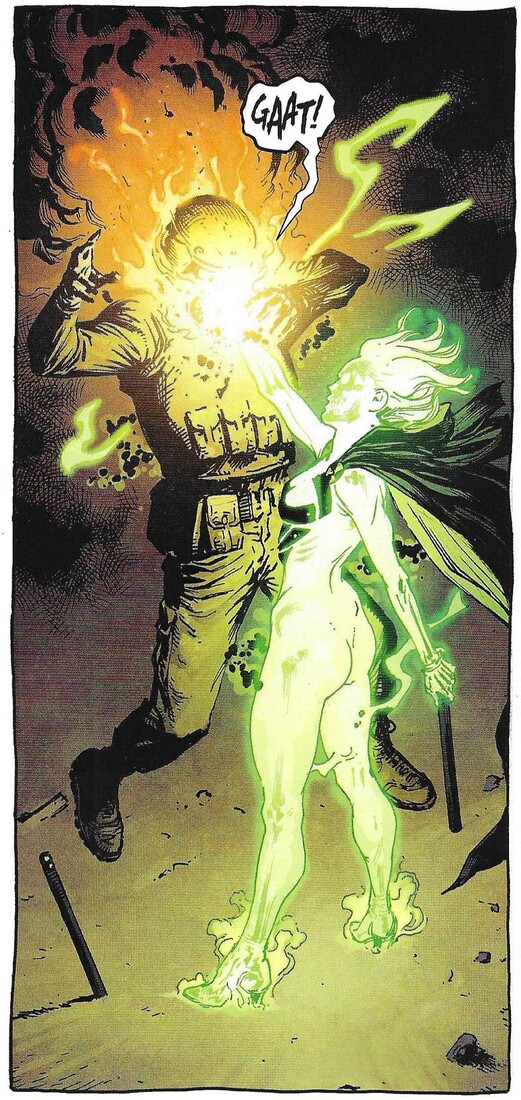 Johns’s flagship “Ghost Machine” title continues to roll merrily along, as out hero, Tariq, is bummed because he’s, you know, a radioactive dude (plus, I mean, his family is dead, which can’t be fun), but his buddy, Nate, keeps trying to cheer him up. Unfortunately, Tariq’s radioactive-ness is getting a bit out of control, so Nate gets him to Lewistown, Montana (with Junkyard Joe, who shows up in the first issue of this trade, along for the ride) and begs for help from … the Radioactive Woman, Ashley Arden (Geigerette?)! She reluctantly agrees to help Tariq, but Pop Culture Rule #1 is never far from our mind, is it, and Ashley has (wait for it) A HIDDEN AGENDA!!!! But what is it? Will it kill our hero, or do something else that’s not as bad? NO MAN CAN SAY! (Which is probably why it’s a woman’s plan.) Oh, the drama!
