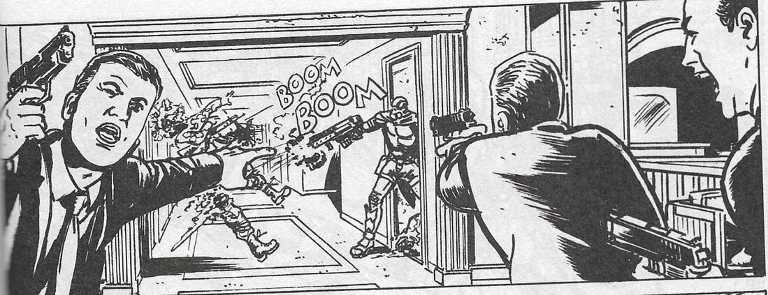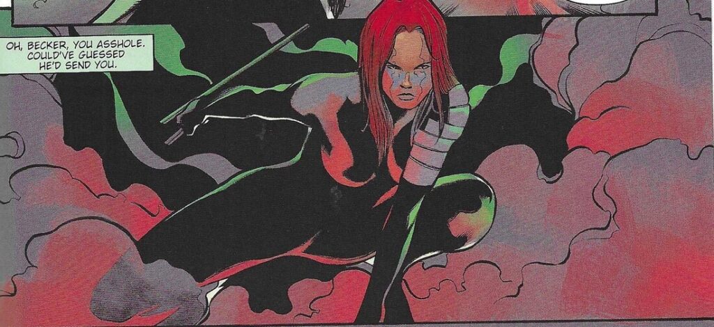 Kindlon isn’t the greatest writer, but he’s carved out a nice career doing his thing, so good for him! He seems to have planned this for four issues, which is what we get, but according to him, sales were great, so they’re moving on with the story. I do wonder if he changed the ending a bit to allow a sequel, because if this ending was his original plan, it very much leaves things open-ended, so it would have been weird if he didn’t plan on more. But, Kindlon writes in the back that he didn’t want the book to be anything other than what it was, which is a full-on pulpy action adventure — Greg Hatcher, I think, would have loved this book — with a very Seinfeld-esque sensibility: “Nobody learns anything.” Kindlon was very clearly influenced by action movies of his youth (I don’t know how old he is), in which the good guy simply shows up and fights bad guys and we learn next to nothing about him. Gehenna, his protagonist, is very opaque in this comic — we know her husband was killed over a very stupid “offense” to a mobster, but we don’t know much more about that, plus she has a kid about whom we know nothing. In the beginning, she is trying to find another mobster, who “owns” the hit on her life, which was put on her because she started killing people for revenge. She can’t find the mobster, but she finds his son, who is immediately in danger because a bunch of people seem to want him dead. Gehenna switches to “mama bear” mode and begins protecting the kid, and the entire comic is her trying to get away from the killers and killing them when she can’t get away. It’s quite relentless.