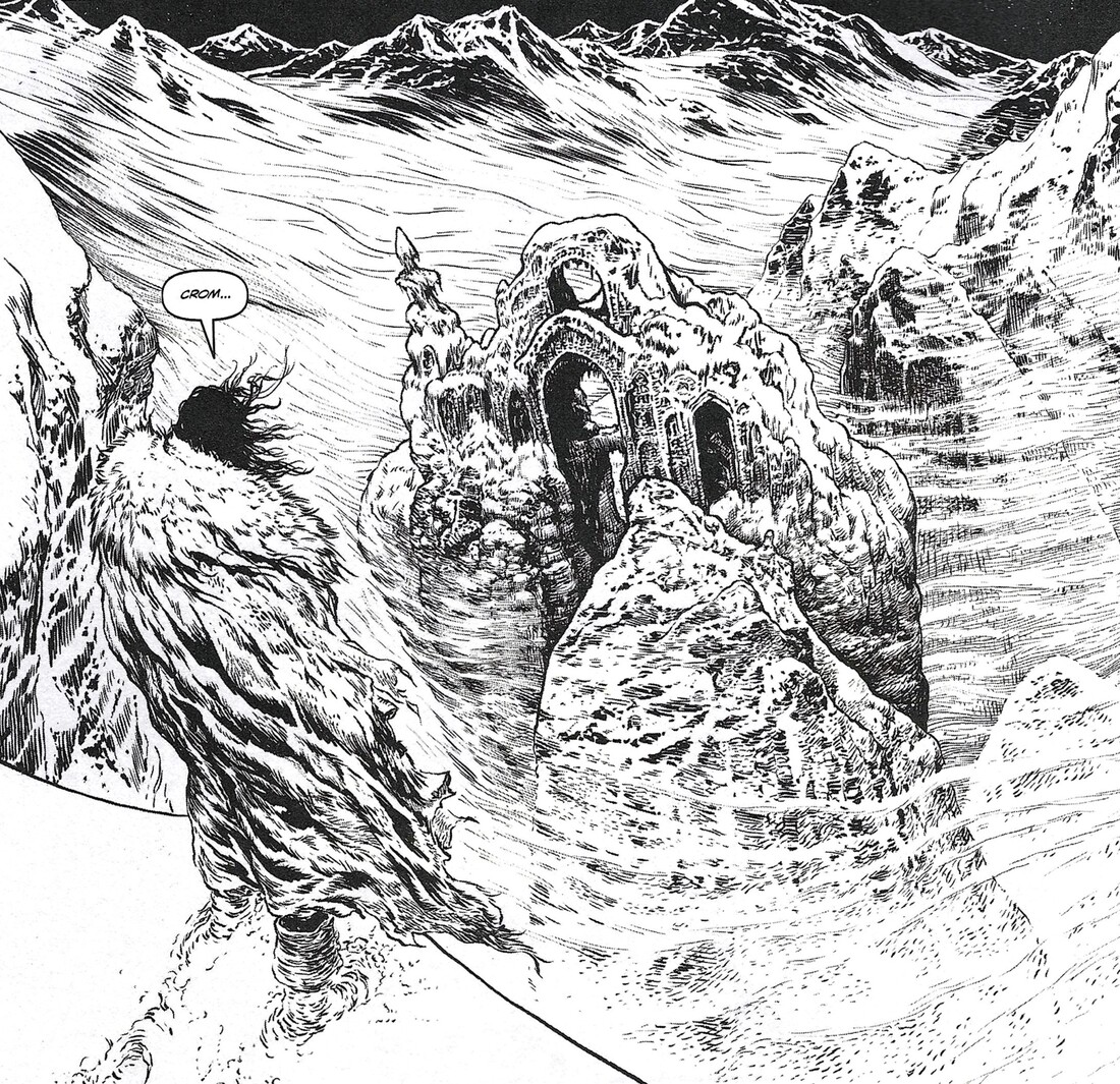 Anyway, Sharp is back in this issue with a much longer story than his last one, and it’s terrific, as you might expect. Conan is out in the East somewhere, and the men he’s leading are slaughtered, and he ends up in the mountains, and there’s a king who looks exactly like him (it’s not him, though!!!!), and there are other dimensions, and ancient feuds, and weird mages, and mystical artifacts, and it’s all very cool. I don’t mean to be facetious — the story is engaging and well done, but, I mean, Sharp’s art is the reason we’re here, and it’s definitely worth it. Sharp’s work is stunning here, from the raw violence of the ambush and the freezing world Conan navigates to the ornate and baroque beauty of the king’s and mage’s courts. When Conan meets one of the mages, there’s a double-page spread of her sanctum, and it’s gob-smackingly beautiful. Sharp uses rounded panels to make our eye flow across the page easily, and he often uses parts of the scenery as panel borders, integrating each individual panel into a larger whole. His brushwork is exquisite, creating a weird yet somewhat earthy world in which magic and rough violence clash. It’s a staggering piece of work, culminating with a double-page spread of a cracked world and sky that will leave you breathless.