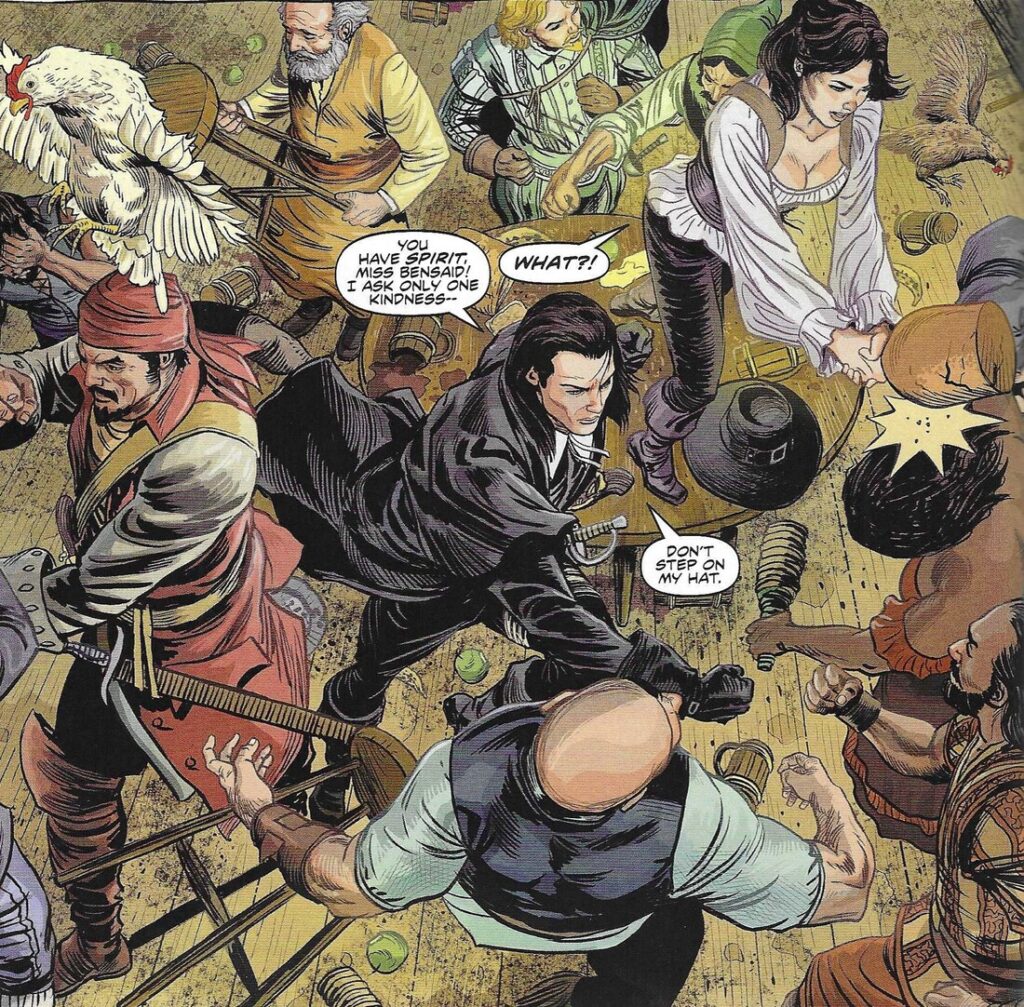 Zircher claims he’s a big fan of Solomon Kane, and if he wants to keep making comics as good as this one, I’m on board with it, as this is a terrific comic. It takes place earlier in Kane’s life, as Zircher explains in the backmatter, and it’s set during the reign of Elizabeth between, it seems, 1585-1592 (based on context clues). He’s on an English ship that attacks a Portuguese caravel, and he kills a passenger by accident and, to atone, takes the man’s package and delivers it to Abramo Bensaid, a Jew living in Venice (with, it should be noted, his comely daughter Diamanta). The package is a treasure map, showing the way to the serpent ring of Thoth-Amon, which is in West Africa somewhere. Abramo is an archivist who knows a lot about ancient, esoteric things, so he and the dead man were hired by a former Knight of St. John to find the ring. The knight, Rolando Zarza, also shows up in Venice with a friend of his, Nico Cassini, and they all end up on an expedition to Africa to find the ring. Meanwhile, in Africa, a Jesuit missionary, Father Goncallo, meets up with a priestess of an African religion, and things do not go well. When Kane and his group meet Goncallo later, he’s not exactly on their side. They head into the wild to find the ring, and bad things start happening, as you might expect.