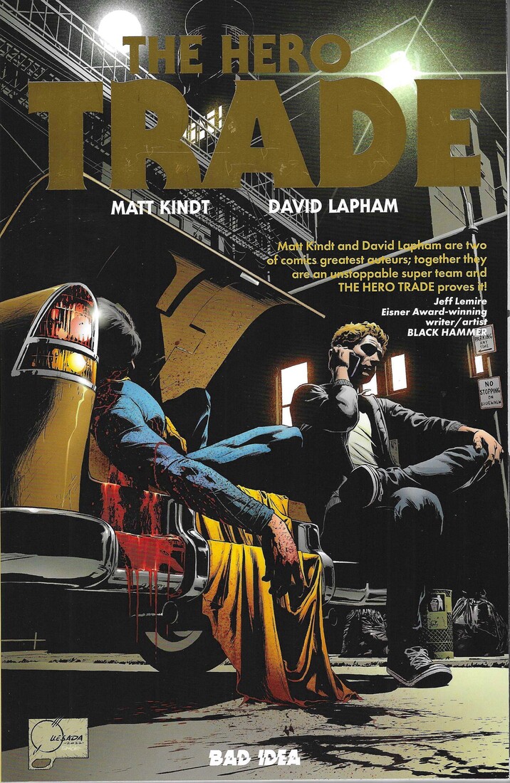 The Hero Trade by Matt Kindt (writer), Robert Venditti (writer), David Lapham (artist), and Dave Sharpe (letterer). $12.99, 190 pgs, Bad Idea.
