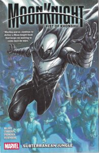 Moon Knight: Fist of Khonshu volume 2: Subterranean Jungle by Jed MacKay (writer), Domenico Carbone (artist), Devmalya Pramanik (artist), Rachelle Rosenberg (colorist), Cory Petit (letterer), and Jennifer Grünwald (collection editor). $17.99, 110 pgs, Marvel.