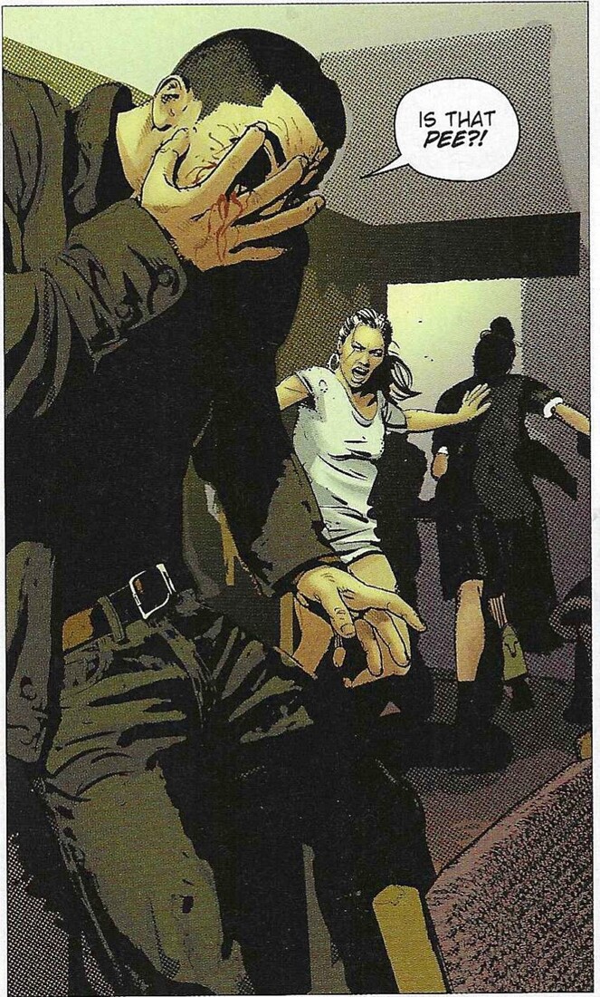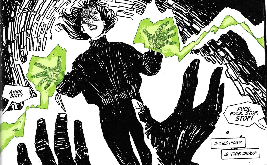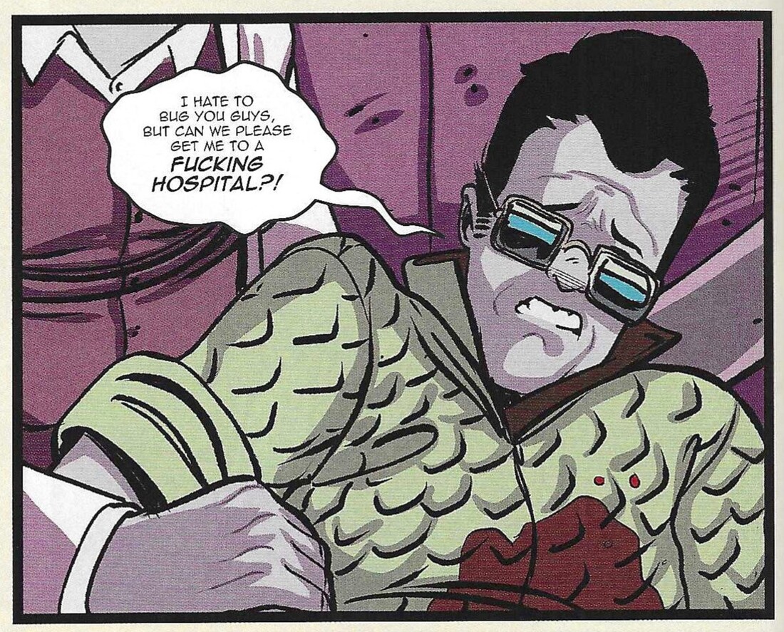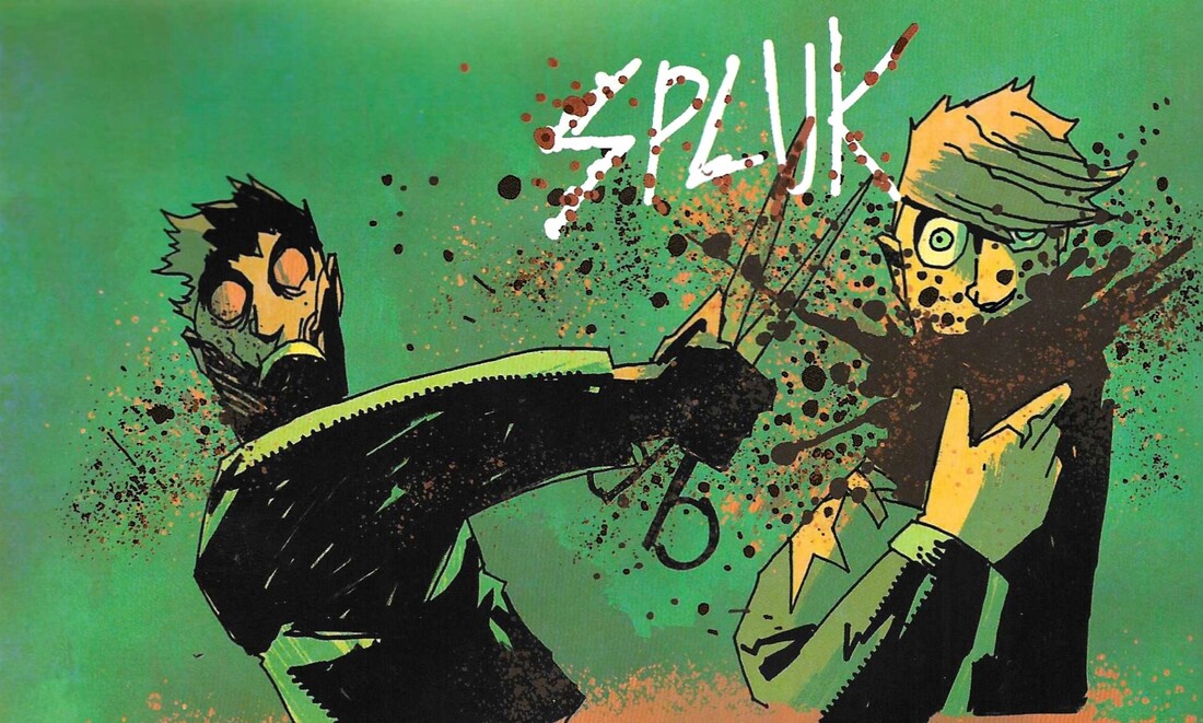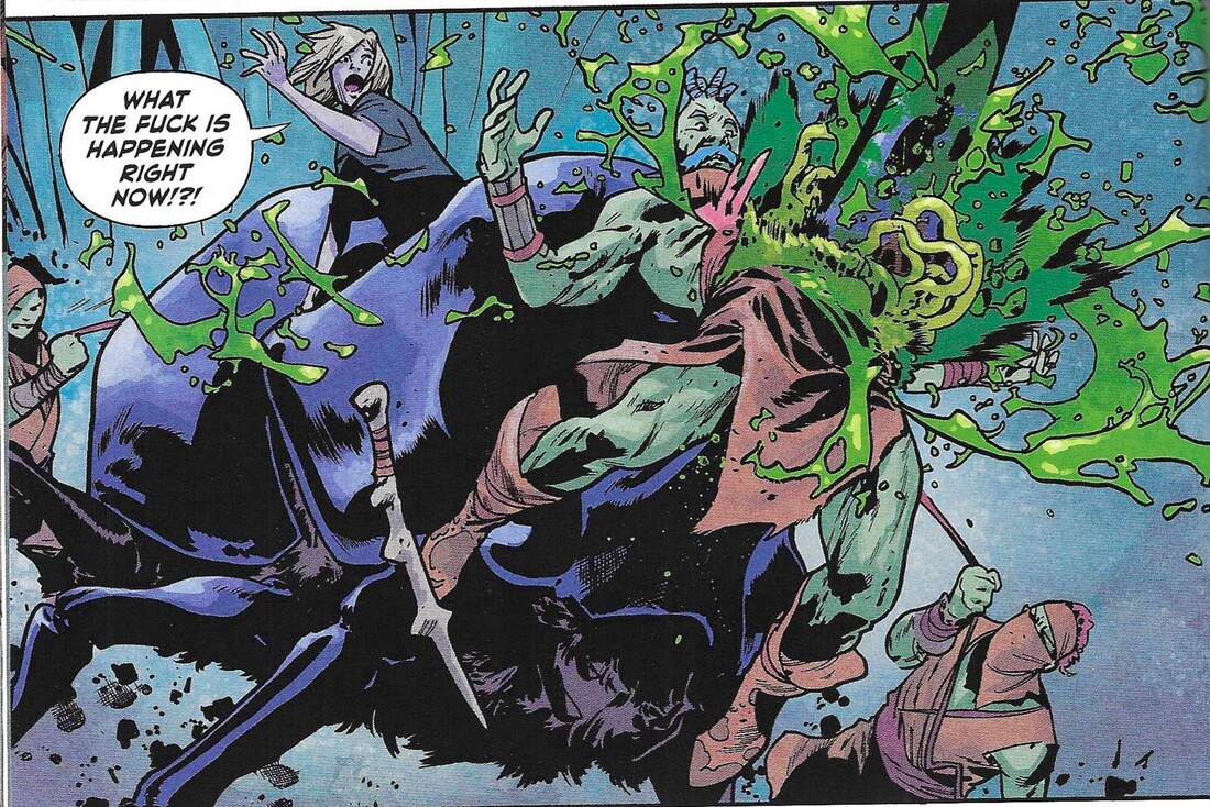 Kraus is a novelist and screenwriter (he co-wrote The Shape of Water), and it appears this is his first comic, which is pretty impressive, because he does a very good job with it. Athanasia is a bleak, parodic take on superheroes, and while there’s kind of a happy ending, it’s still pretty downbeat for most of the time. (That’s not to say it doesn’t earn the happy ending, and it’s not a completely cheery happy ending, but it’s still not as gloomy as the rest of the book.) Kraus sets the book in Venture City, which is home to the Justice League-esque Dynamic Guild. The Guild has been around for decades, and people in Venture City read comics and watch movies based on their real-life exploits, and radio talk show hosts discuss the heroes on their shows … it’s very meta, in other words, but, I mean, it’s not like Marvel and DC don’t do this, it’s just that Kraus shows how baked in the concept of entertainment based on superheroes would be if superheroes actually existed. Because of this, the Guild is a corporation, and they have public relations, and they protect their image — you know, just like real-world corporations and celebrities do. They have built a cemetery for their dead, too, and that’s where our protagonist, Forrest Molson, comes in. She’s a fourth-generation groundskeeper of the cemetery, which she works with her dad (her grandfather is still alive, but he’s retired). Forrest should be in college, but she dropped out of high school because of a tragedy in her family — her sister’s accidental death — and her subsequent addiction to pills because she believes her sister’s death was her fault (which is sort-of was, but also sort-of wasn’t). She’s bitter about her situation and bitter about the fact that superheroes spend their time fighting supervillains instead of dealing with the real problems of the world … again, nothing groundbreaking here, but it’s still a decent plot point. One night, in a rage, she damages one of the monuments to a fallen hero in the cemetery, and discovers that when they die, whatever “stuff” made the superheroes super has oozed out into the soil and can be collected. When Forrest touches the stuff, she temporarily gains the powers of the hero … with some twists, of course, but basically, if she uses the “Flash’s” ooze, she can run fast. Forrest, of course, decides to become a vigilante, taking down men who abuse women. Of course, it all goes horribly wrong.