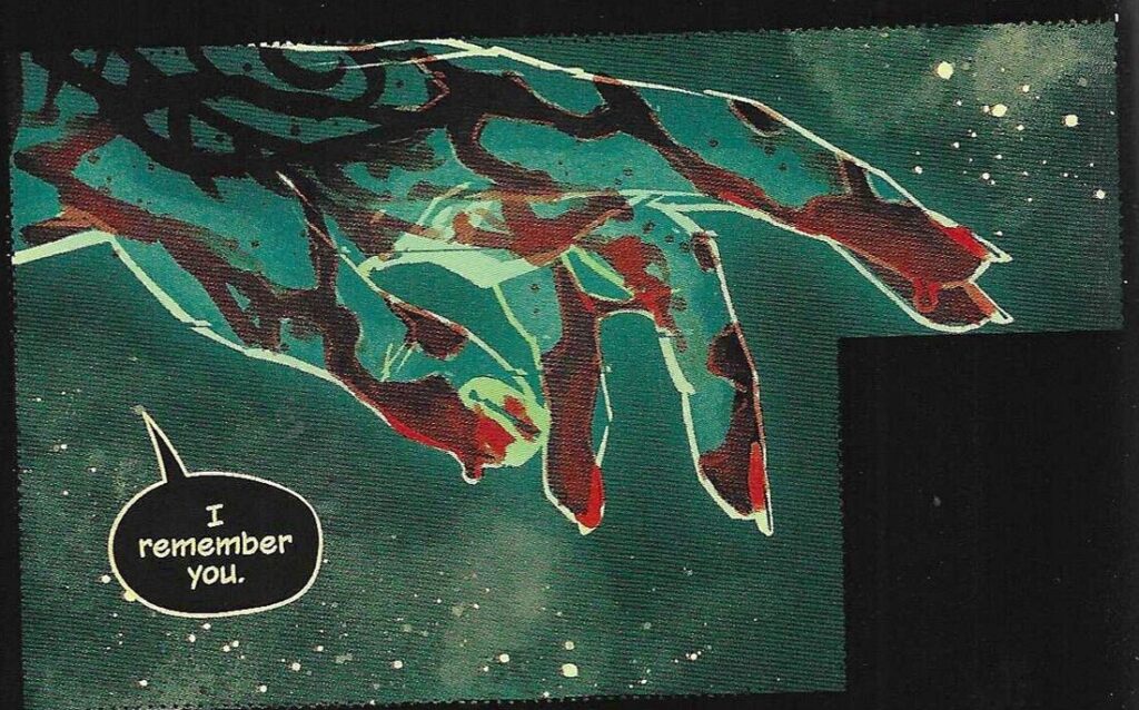 Then Tynion takes us to 2049, when the world is destroyed, and shows us a nice utopian society where everyone loves everyone else, and one of the W0rldtr33 dudes says that it’s all groovy and that’s the way it should be and wouldn’t everything be nicer if we could be like that utopia, even though it gets wiped out pretty quickly once the Evil Internet Hive Mind finds it. Oh well. Life goes on, to coin another phrase.