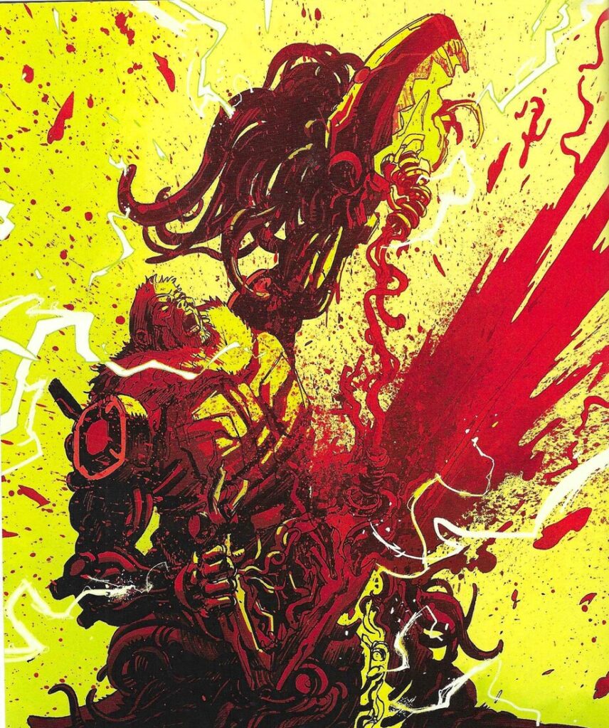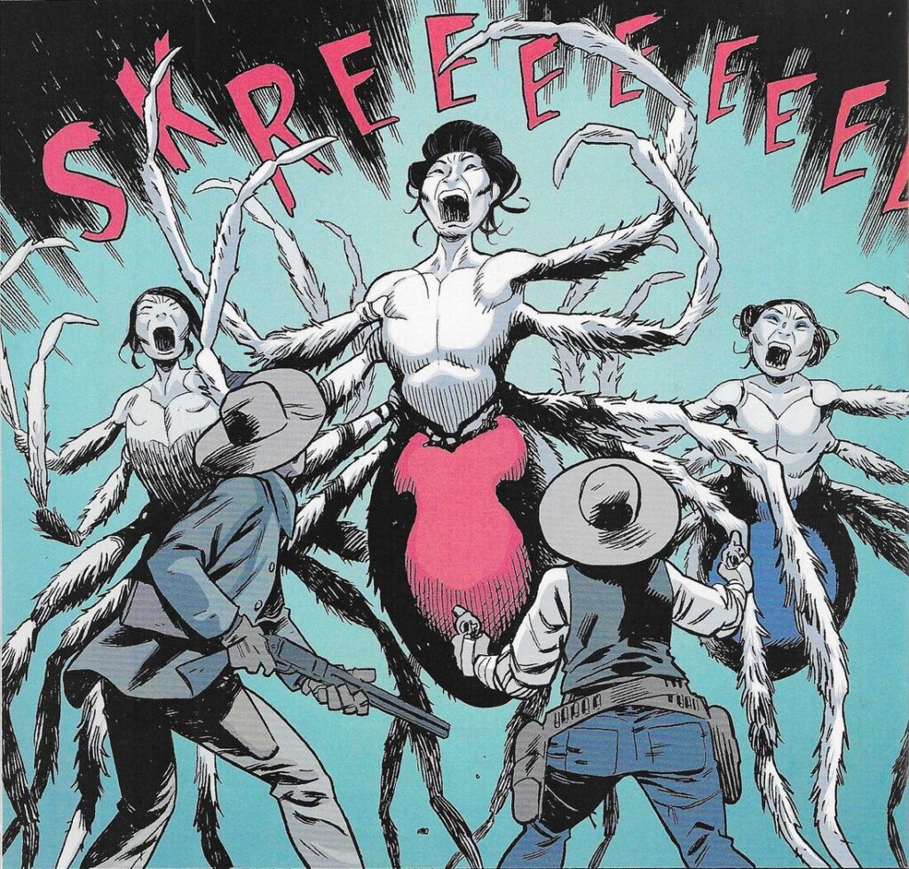 Asrar is stupendous, of course. His mytes are weird and a bit creepy and human enough that we can relate to them but insectoid enough that they’re a bit repellant (I know, we all love all of God’s creatures, but insects are fucking icky), and the actual insects are really done well. He does a wonderful job with the scale of it all, as we’re reminded at crucial times how small Slade is, which is neat. The section with Slade in the spider lair is very creepy, and when things get apocalyptic in the final issue, Asrar is marvelous at showing it in all its awful glory. Asrar is excellent at action, and his fight scenes are wonderfully choreographed. He gets to get really gory, too, which I’m sure he had fun with. Back in the day, when Jay Faerber got Asrar to draw Dynamo 5 for him, I wrote something about how the Big Two need to snap him up. They did, and he did great work for them, and I’m glad he’s at a point where he can do something weird and wild like this instead of just drawing a random superhero title. The art is amazing, as I figured it would be.