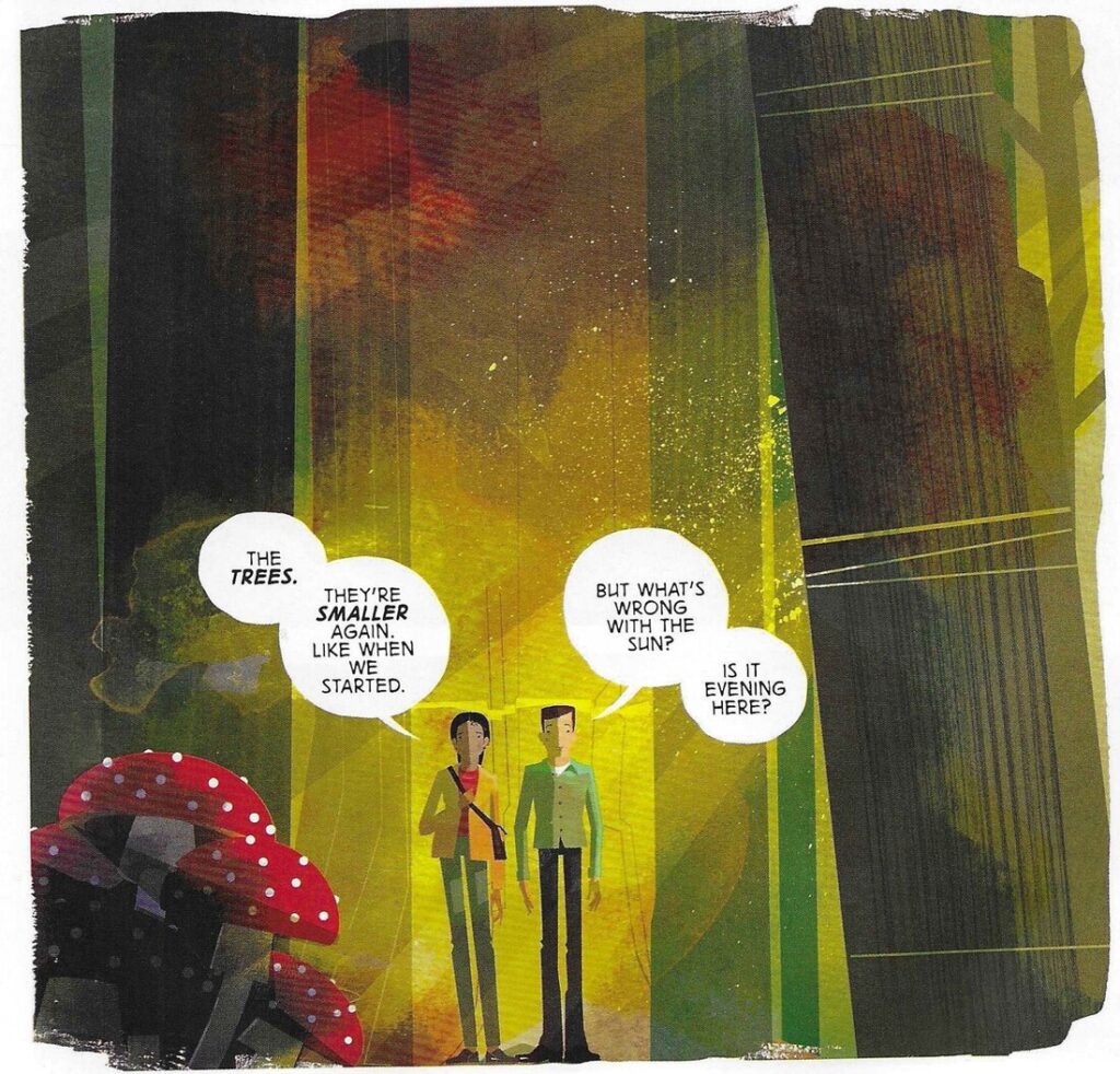 Konyu’s art, which reflects his animation background, features lots of simple shapes and straight lines, but like a lot of very good artists, he can change the emotion of his characters by making tiny changes, and as Meera and Mark get deeper into the mystery, he does a good job showing how it’s weighing on them. The squared-off housing and the conical pines are a nice contrast between civilization and wildness, and Konyu does it well without cluttering the page too much. His coloring makes the book — so many deep greens and blues, which are set off by the sinister reds that slowly invade the scene, and when the two people experience something odd, Konyu smears the colors a bit to make the moment a bit more unsettling and upsetting. Konyu’s style appears simplistic, but there’s a lot going on in the artwork that makes you appreciate the entire package even more.