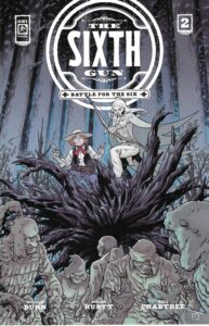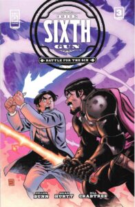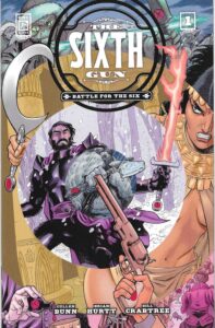 The Sixth Gun: Road to the Six #0 and Battle for the Six #1-3 by Cullen Bunn (writer), Brian Hurtt (artist), Travis Hymel (inker, issues #2-3), Bill Crabtree (colorist), Crank! (letterer), Azat Sayadi (assistant editor), and Bess Pallares (editor). $22.96, 114 pgs, Oni Press.