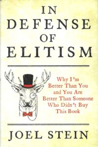 In Defense of Elitism: Why I’m Better Than You and You Are Better Than Someone Who Didn’t Buy This Book by Joel Stein. 308 pgs, 2019, Grand Central Publishing.