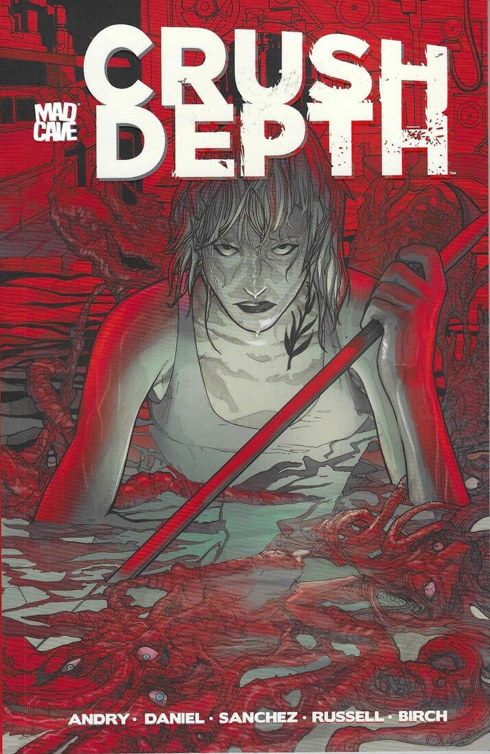 Crush Depth by David “DB” Andry (writer), Tim Daniel (writer), Alex Sanchez (artist), Kurt Michael Russell (colorist), Jason Finestone (colorist), Justin Birch (letterer), and James B. Emmett (editor). $17.99, 110 pgs, Mad Cave Studios.