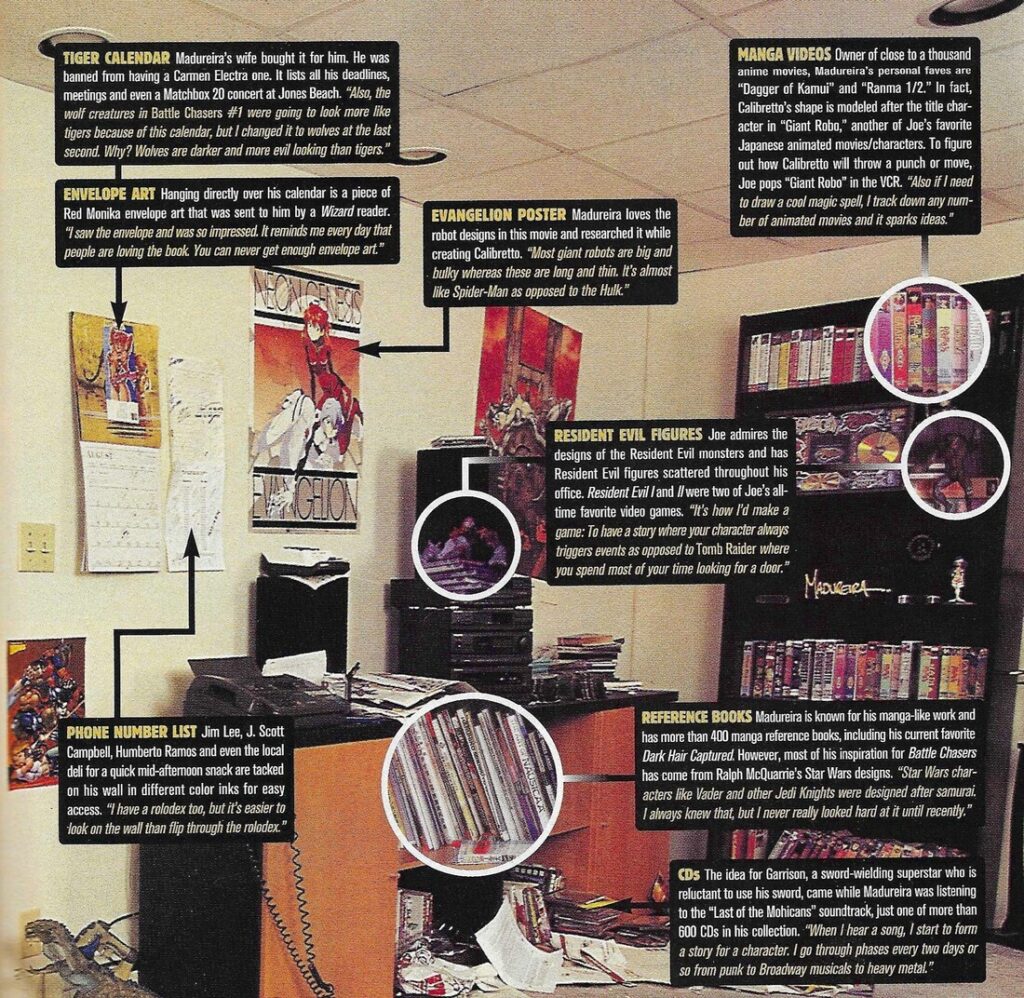 Beginning on page 38, Wizard gives us a look inside Joe Madureira’s studio. It’s a lot. There are, as if you can’t guess, a ridiculous amount of manga videos, CDs, and various figures and props. There’s also a hand-written phone number list that sounds so archaic today, a note on his calendar about a Matchbox 20 concert coming up (the dude was 23 at the time, so I guess we have to cut him some slack), and, of course, a video game console and hundreds of games. Joe Mad seemed to disappear down a video game hole for some years, so I guess it’s good he plays a lot of them! It is a very-very-1990s, dude-in-his-20s bro cave. Joe Mad is living the dream!