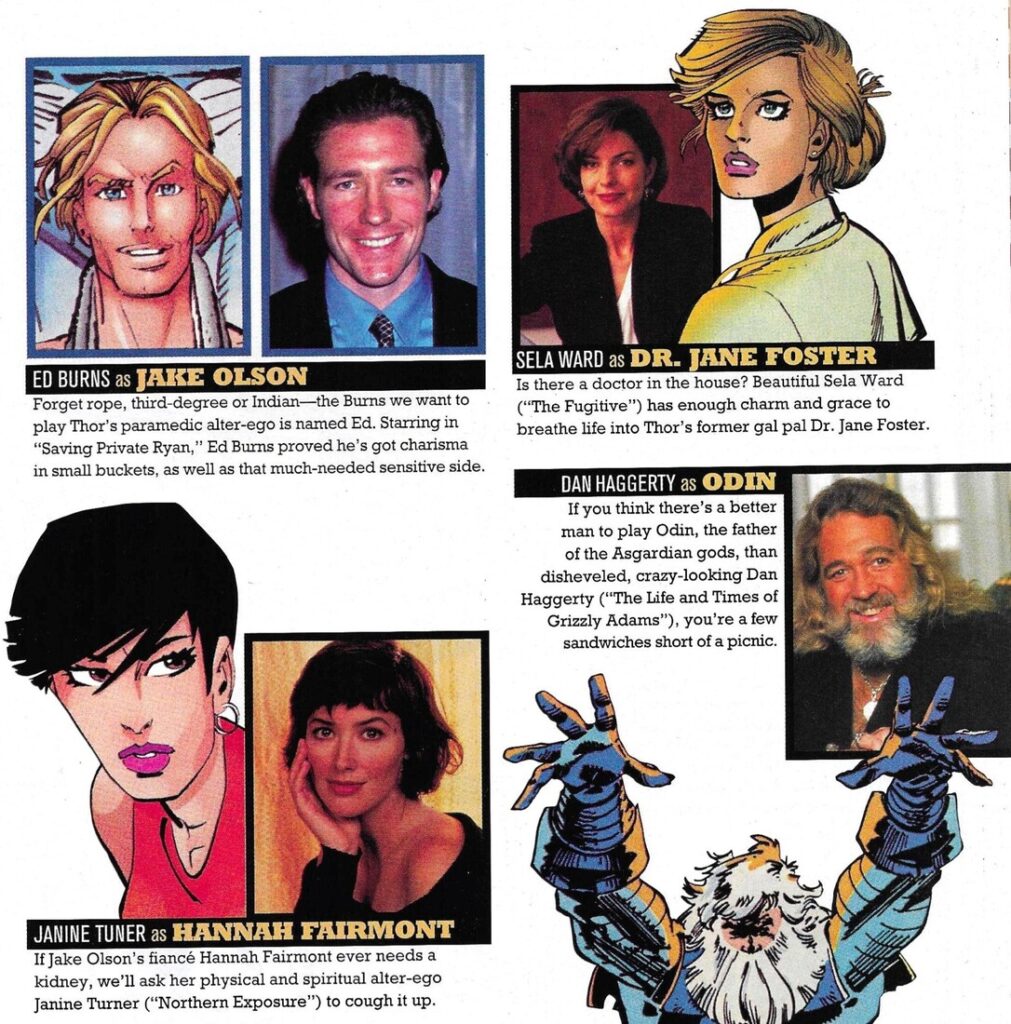 On page 72, Wizard does its casting thing again to give us a Thor movie! Dang, this should be fun. The problem is that late-1990s Thor, like so much of Marvel, was a bit of a clusterfuck, so keep that in mind as Wizard casts characters who would disappear and never return. For Thor, they cast Ralf Moeller. Whodafuq? Moeller is a bodybuilder who has done some acting, usually as the big tough guy, although he was Conan in the television show that aired at this time. I have no idea if Moeller is any good at acting, but I’m glad that when Marvel did get around to making this movie, they cast someone who might be a big dude, but also did some “real” acting rather than just playing the heavy in a Jean-Claude Van Damme movie. But here’s what’s weird: Wizard cast Edward Burns as Jake Olson, Thor’s alter ego. I mean, I’m glad that Hemsworth didn’t have one in the movie, but did Wizard expect there to be a flash of lightning and have Moeller turn into Burns? I guess? Burns is fine — he’s kind of a bland actor, but I guess that’s what you’d be going for with this move. Burns is nine years younger than Moeller, so that would have been a bit odd, too. They cast Sela Ward as Jane Foster, which is fine. As Odin, they cast Dan Haggerty, which … I kind of love? Haggerty was in his mid-50s at the time and hadn’t done much of note since his Grizzly Adams days 20 years earlier, but he was still working, and I think it would have been pretty cool. Hopkins brings his British gravitas to the role, sure, but Haggerty would have brought some good old-fashioned ‘Murican wackiness to the role. Apparently, Jake Olson had a fiancée, Hannah Fairmont, and Wizard cast Janine Turner to play her. I have always liked Turner, and I’m sure she would have been fine in the role. Turner had a brief “It Girl” moment in the mid-1990s, but it didn’t last and her star quickly faded, but maybe starring in a big-budget Thor movie would have turned that around! Olson also has a paramedic buddy, Demitrius, and Wizard puts Tommy Davidson in that role. I guess. They actually do a good job with the Warriors Three: George Buza is Volstagg (Buza has had a long career in voice talent but just a minor one in front of the camera, so I’m not sure why Wizard picked him), Scott Glenn as Hogun (which is kind of excellent casting), and Cary Elwes as Fandral, which is really excellent, as he could basically play a slightly older Westley. They cast Hudson Leick as the Enchantress — another actor who’s famous for, it seems, looking good in not a lot of clothing, so good for her. Finally, they cast James Woods as Loki. Woods was almost 50 at the time, so he might have been a bit too old for the role, but that’s a good choice, as Woods always brings a twitchy energy to his work, even as he’s gotten older (and, it should be noted, entirely too Trumpy). But that’s a pretty good choice, even though Hiddleston really nailed the role when Marvel finally made the movie. So, that’s their cast. While I don’t love their Thor/Jake choices and it’s too linked to the early part of the Jurgens run (neither Hannah nor Demitrius stuck around very long, it seems), some of their choices are pretty darned cool.