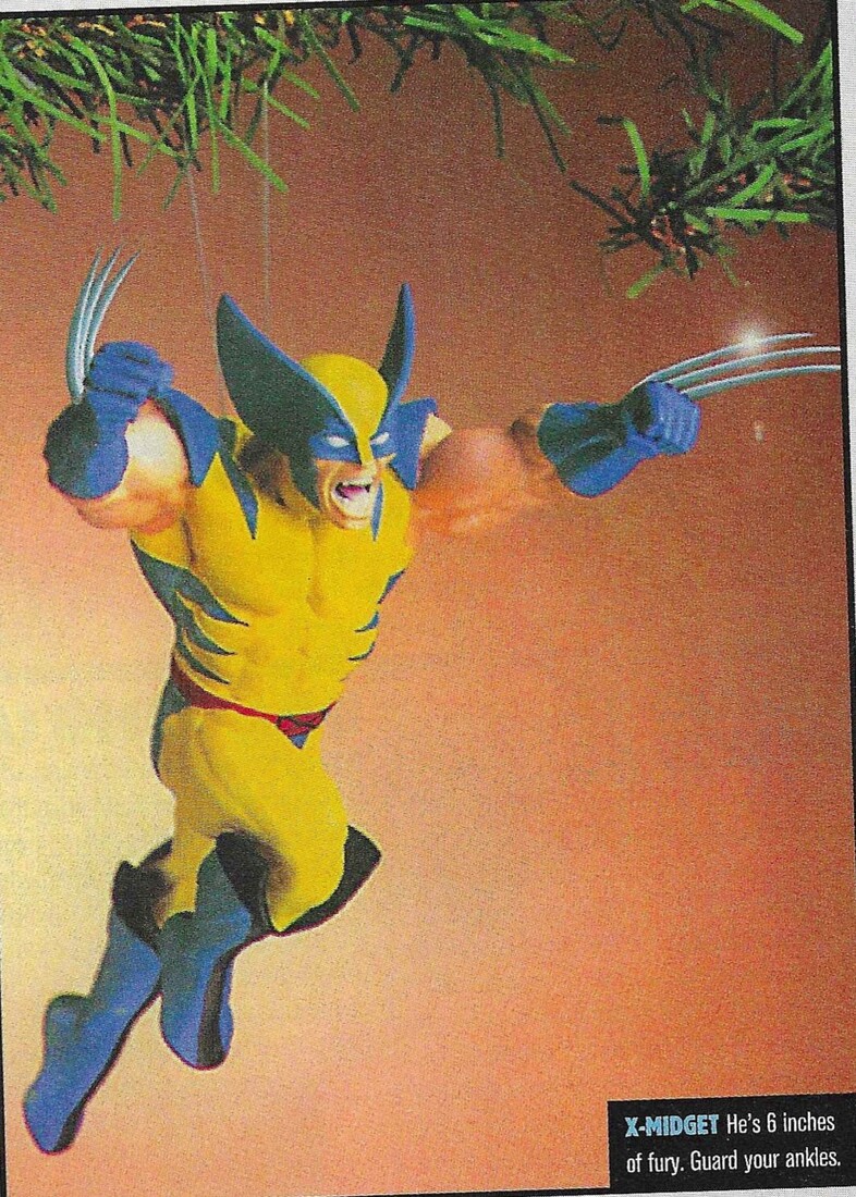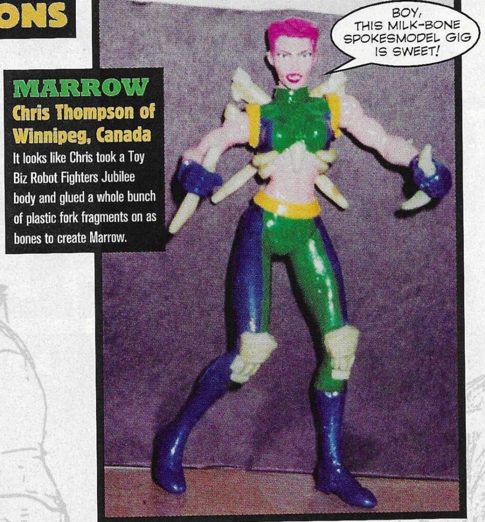 Moving on, Bill’s favorite artist is back, as Califiore shows us how to use shadows. This is pretty cool, actually. Wizard always has neat artists writing about neat things! Next we get some new action figures that are showing up, including an Astro City line and Bone line, both of which look keen. There’s also a Turok-fighting-a-dinosaur figure, a Grendel mask, an Endless PVC set, and a Wolverine Christmas ornament, which I really want. Limited to 5000? Come on, people! Then, we get to the make-your-own section, which features this wild (non-winning) Marrow figure: