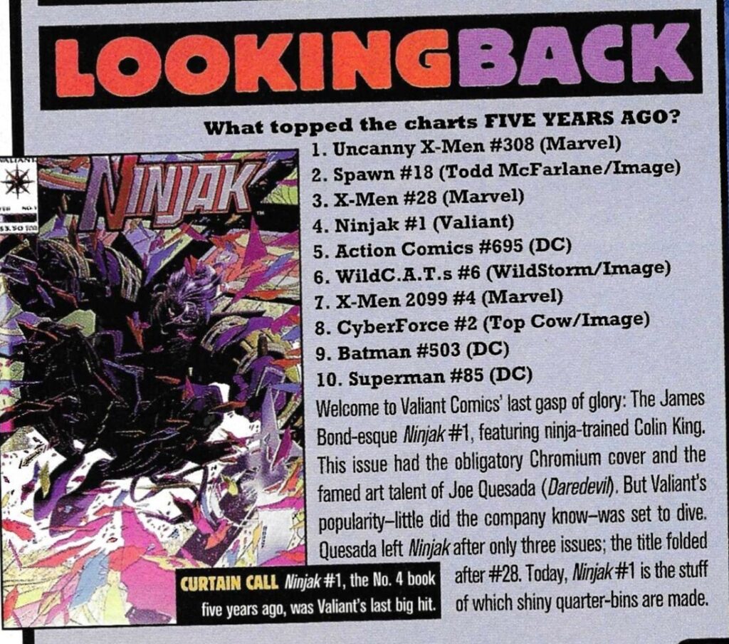 On page 133, we find the top 10 back issues. Battle Chasers #1 and Danger Girl #1 are the top 2, which isn’t surprising, but Wizard is a bit gobsmacked that Pat Lee’s Darkminds #1 is #3. Uncanny X-Men #350 is #4, the holofoil altenate of Witchblade #25 is #5, and Spider-Girl #1 checks in at #6. Mutant X #1 — hey, remember Mutant X? — is #7, while KISS: Psycho Circus is still hanging around at #8. Nightwing #1 and Daredevil #1 round out the top 10. They take a look back 5 years, which is always a treat: